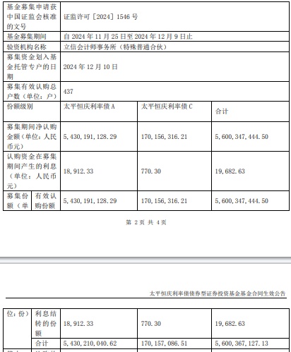 中国经济网北京12月11日讯 今日,太平基金管理有限公司发布太平恒庆利率债债券型证券投资基金基金合同生效公告。