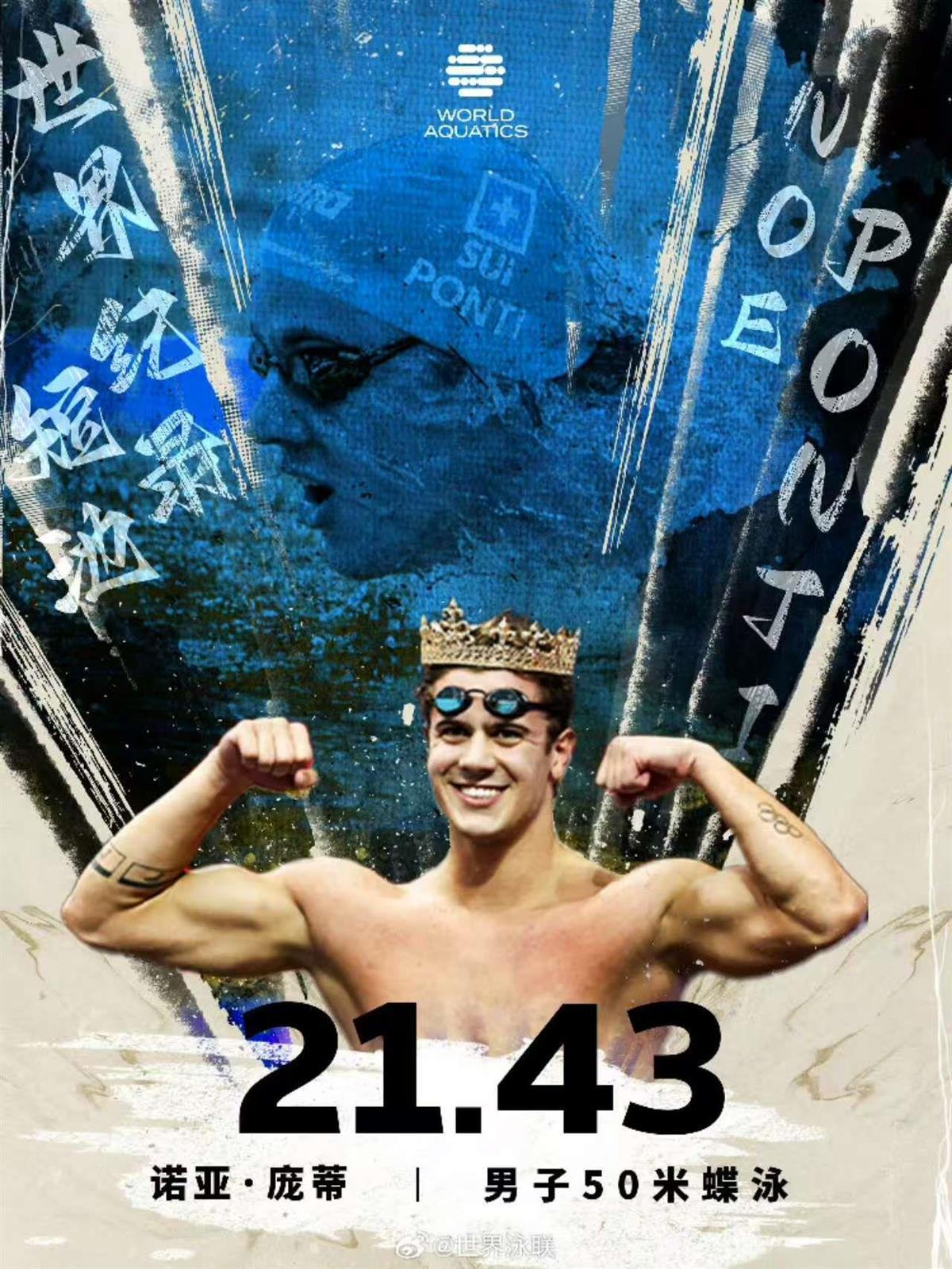 再看男子50米蝶泳,瑞士选手庞蒂的表现,同样精彩。预赛上,他以21秒53的成绩刷新赛会纪录。进入半决赛,他继续保持了超好状态,最终以21秒43的成绩,刷新了此前一直由他保持的世界纪录。