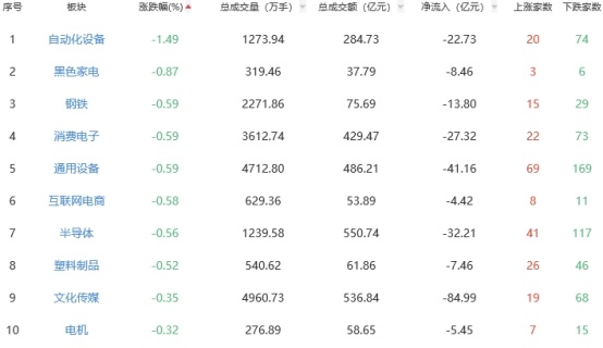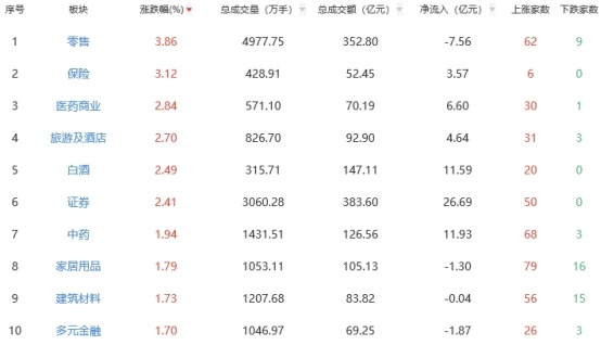 板块方面,零售、保险、医药商业、旅游及酒店板块涨幅居前,自动化设备、黑色家电、钢铁、消费电子板块跌幅居前。