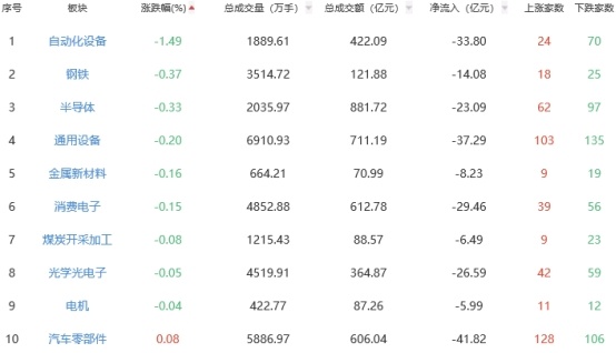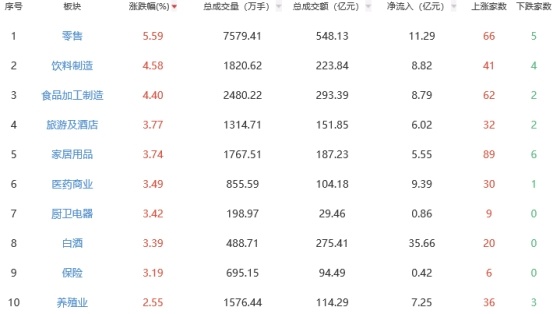 板块方面,大消费板块继续爆发,零售、饮料制造、食品加工制造、旅游及酒店板块涨幅居前,自动化设备、钢铁、半导体、通用设备板块跌幅居前。