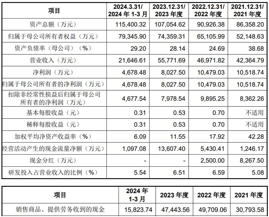 2021年至2024年1-3月,先锋精科的营业收入分别为42,364.79万元、46,971.82万元、55,771.69万元和21,646.61万元;净利润/归属于母公司所有者的净利润分别为10,518.74万元、10,479.03万元、8,027.50万元和4,678.48万元;扣除非经常性损益后归属于母公司所有者的净利润分别为8,362.26万元、9,895.25万元、7,978.54万元和4,677.54万元。