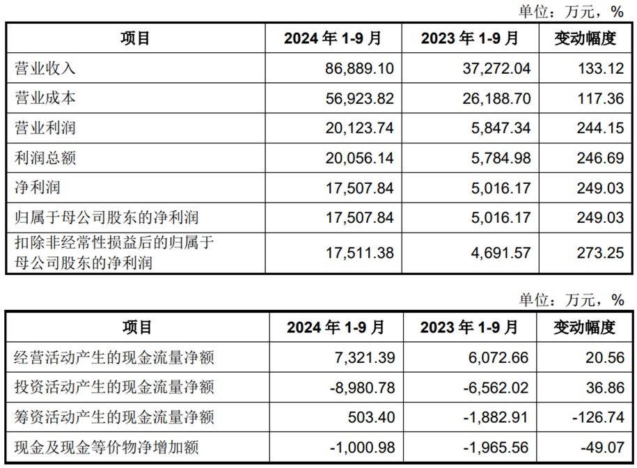 2024年1-9月,先锋精科实现营业收入86,889.10万元,同比增长133.12%;实现净利润/归属于母公司股东的净利润17,507.84万元,同比增长249.03%;实现扣除非经常性损益后的归属于母公司股东的净利润17,511.38万元,同比增长273.25%;经营活动产生的现金流量净额7,321.39万元,同比增长20.56%。