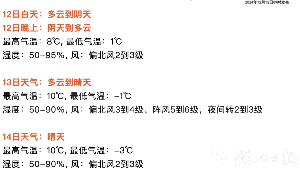 预计未来一周,武汉市基本无雨,早晚气温较低,12-17日最高气温逐步回升。其中13日、17-18日受地面冷空气南下影响,武汉市北风较强。