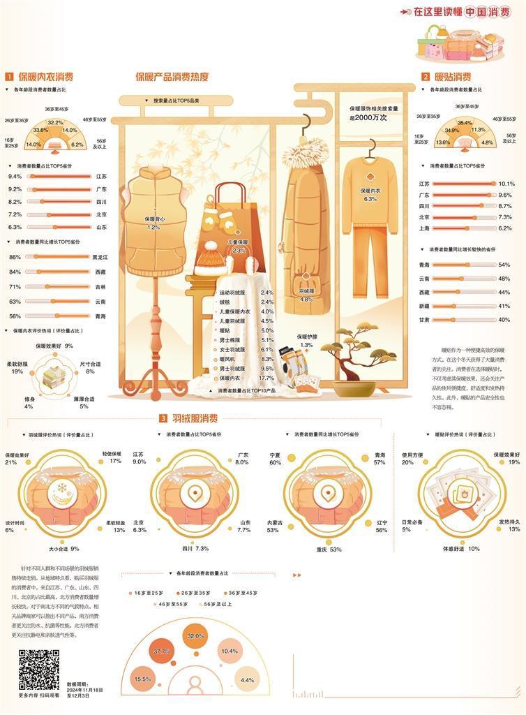 随着气温下降,保暖服饰作为冬季刚需迎来了销售旺季。众多商家紧盯消费需求,抓住“冷”商机,为消费市场增添浓浓暖意。从线上消费趋势来看,近期保暖服饰相关搜索量已超过2000万次,保暖内衣、羽绒服、儿童保暖、保暖护膝、保暖背心是消费者搜索量最高的五大关键词。市场上保暖服饰种类丰富,一衣多穿、灵活百搭的各类保暖服饰深受消费者喜爱。