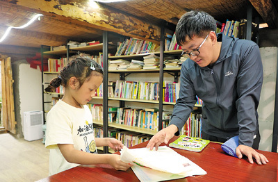 甘文勇(右)在书屋和来阅读的孩子交流。 王靖生摄(人民视觉) |