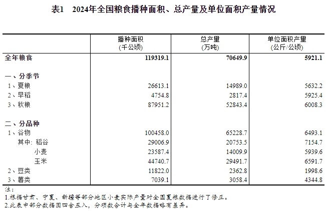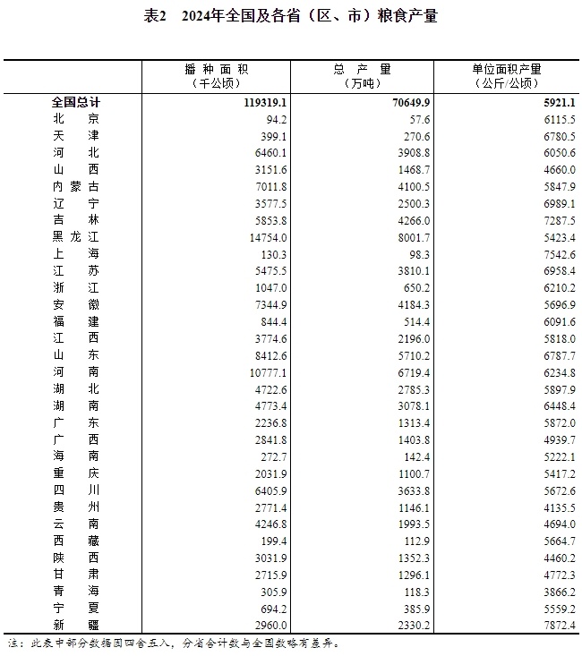 中新网12月13日电 据国家统计局网站消息,根据对全国31个省(区、市)的调查,2024年全国粮食播种面积、单位面积产量和总产量分别如下: