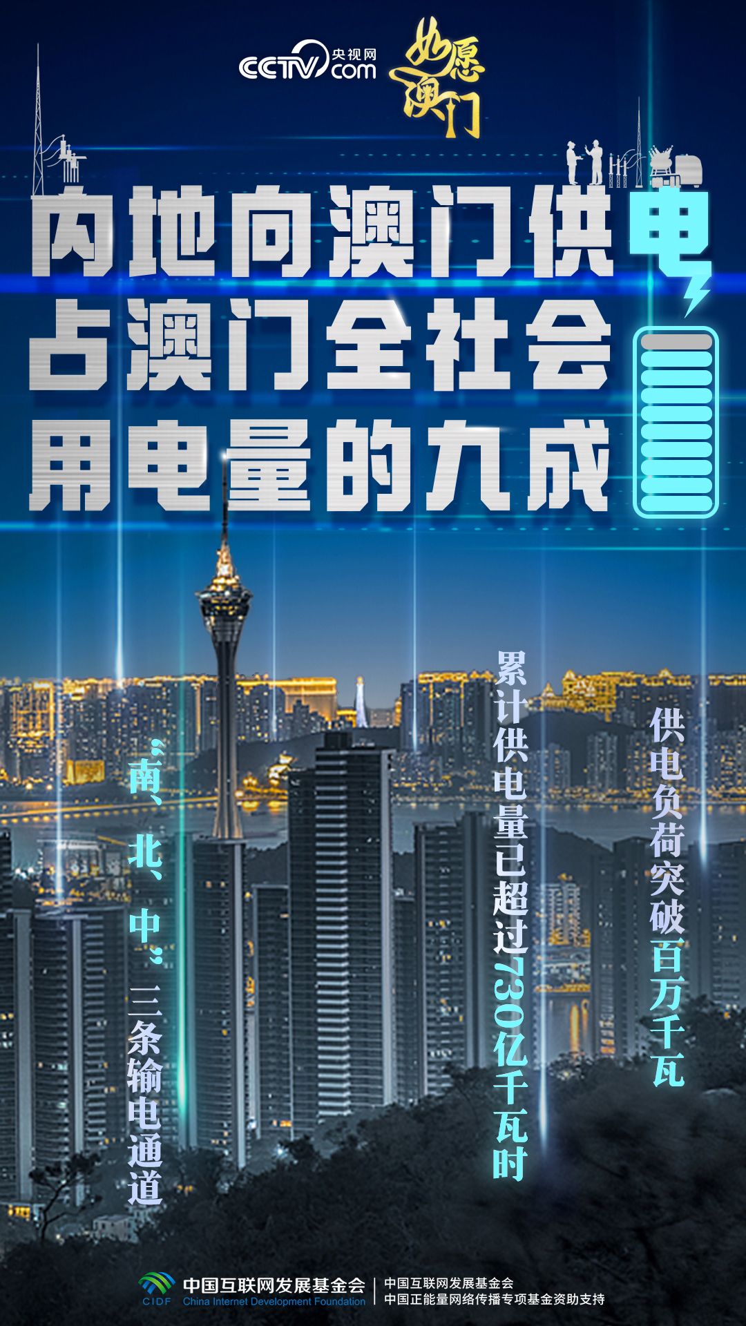 澳门缺电,南海油气田里伸出专供澳门发电的天然气管道,粤澳“南、北、中”三条输电通道接续架设,条条“银线”相连,为澳门经济社会发展注入源源不断的强劲动能。1999年回归当年,内地对澳供电量为1.95亿千瓦时;2024年7月,内地向澳门供电负荷突破百万千瓦,累计供电量已超过730亿千瓦时。