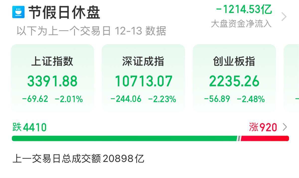 周五,A股全天低开低走,三大指数均跌超2%,沪指失守3400点。沪深两市全天成交额2.07万亿,较上个交易日放量2023亿。板块来看,除了以商业连锁、跨境电商、旅游为代表的大消费板块持续走强外,其它多数板块出现冲高回落。全市场跌多涨少,超4410家个股下跌,仅有920家红盘,尽管如此,全市场仍有超百股涨停或超10%,显示市场呈分化行情。截至周五收盘,沪指跌2.01%,深成指跌2.23%,创业板指跌2.48%。