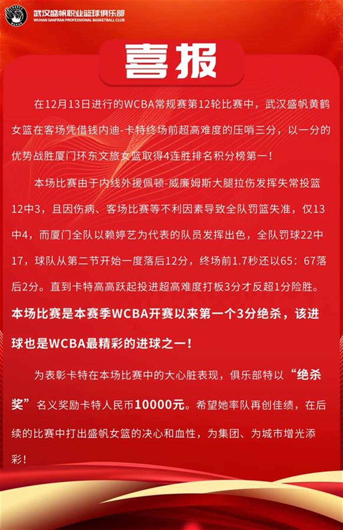 12月13日,在WCBA第12轮常规赛上,武汉盛帆黄鹤女篮在外援钱内迪—卡特压哨投中三分绝杀球后,完成逆转绝杀,队伍收获联赛四连胜。