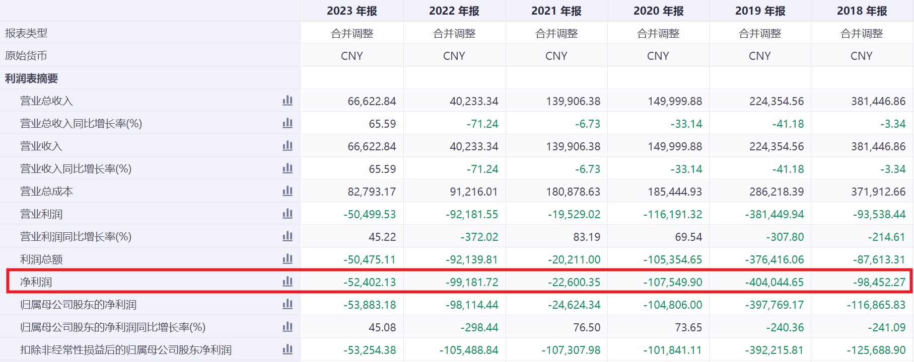 2018年至2023年,华谊兄弟的净利润分别为-9.85亿元、-40.40亿元、-10.75亿、-2.26亿元、-9.92亿元和-5.24亿元。