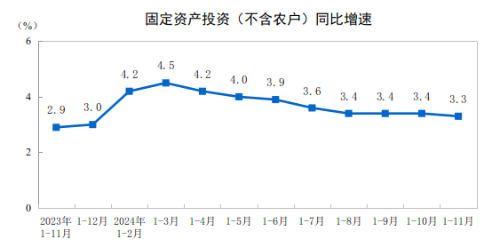 中新网12月16日电 据国家统计局网站消息,2024年1—11月份,全国固定资产投资(不含农户)465839亿元,同比增长3.3%(按可比口径计算,详见附注7),其中,民间固定资产投资233689亿元,下降0.4%。从环比看,11月份固定资产投资(不含农户)增长0.10%。