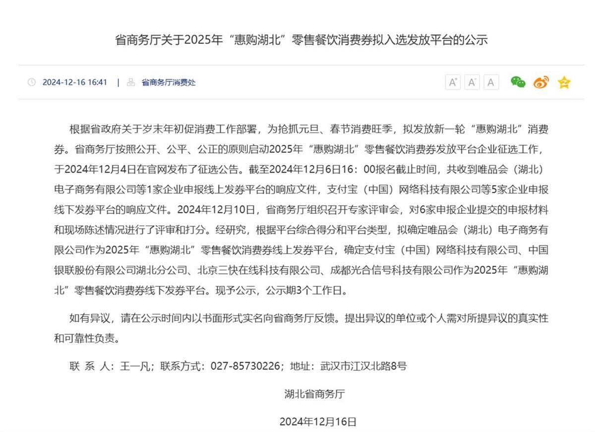 此前,湖北省商务厅按照公开、公平、公正的原则,启动了2025年“惠购湖北”零售餐饮消费券发放平台企业征选工作,并于2024年12月4日在官网发布了征选公告。截至2024年12月6日16:00报名截止时间,共收到唯品会(湖北)电子商务有限公司等1家企业申报线上发券平台的响应文件,支付宝(中国)网络科技有限公司等5家企业申报线下发券平台的响应文件。