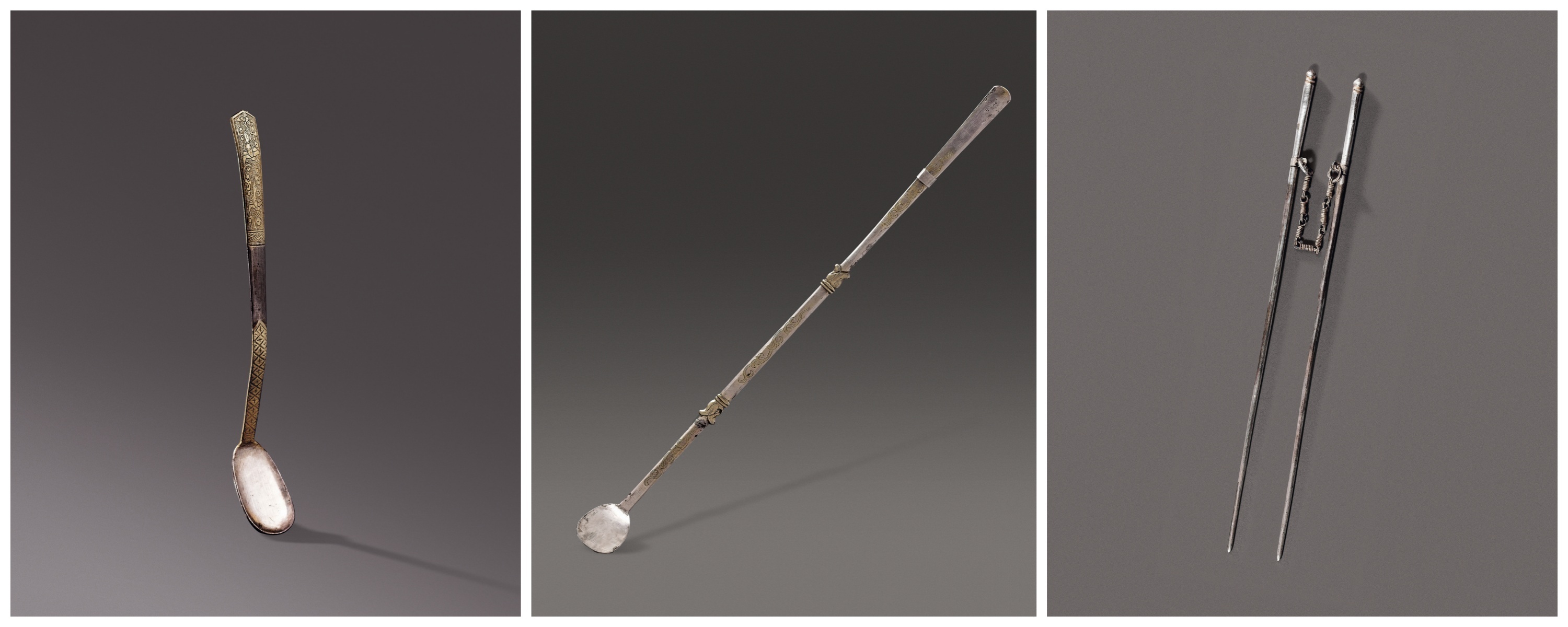 △从左到右依次为银则、长柄银勺、银火箸。