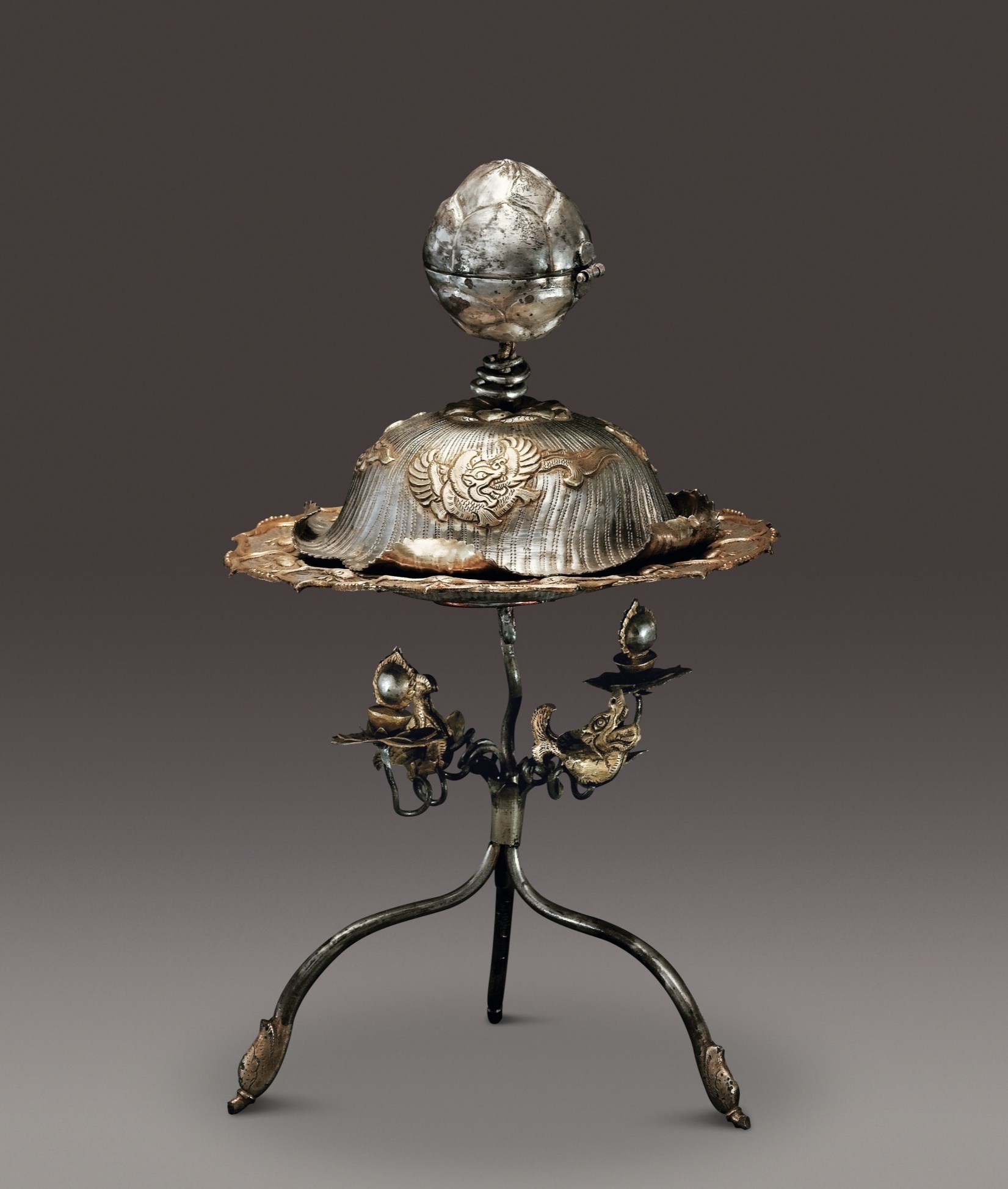 这件银盐台由盖、台盘、三足架组成