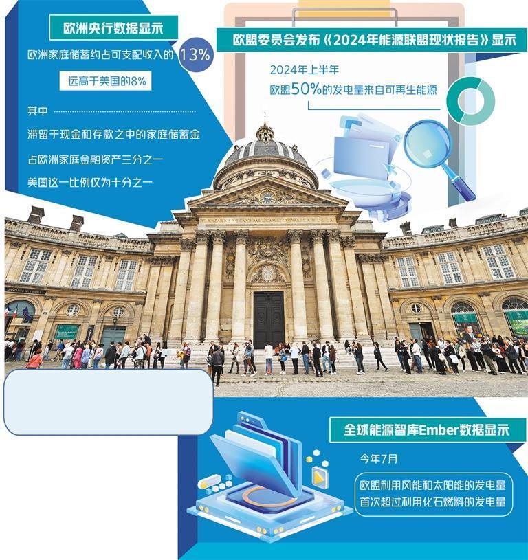 尽管欧洲资本市场目前面临诸多困境,但其在绿色技术与可再生能源领域蕴含较大潜力。9月,欧盟委员会发布的《2024年能源联盟现状报告》中指出,欧盟可再生能源发电装机容量创下新的历史纪录。2024年上半年,欧盟50%的发电量来自可再生能源。根据全球能源智库Ember的数据,今年7月,欧盟利用风能和太阳能的发电量首次超过利用化石燃料的发电量。未来,太阳能与风能产业或将成为欧盟的增长引擎,不仅将带动相关产业链上下游企业发展、创造就业机会,还将有助于欧盟稳定能源市场、加快绿色转型的步伐,为欧洲实现经济增长与增强全球竞争力奠定基础。(经济日报记者 谢梦凡)