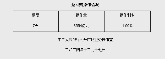 中新网12月17日电 据中国人民银行网站消息,为保持银行体系流动性充裕,2024年12月17日人民银行以固定利率、数量招标方式开展了3554亿元逆回购操作。具体情况如下: