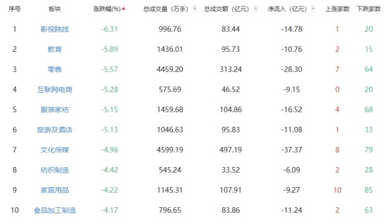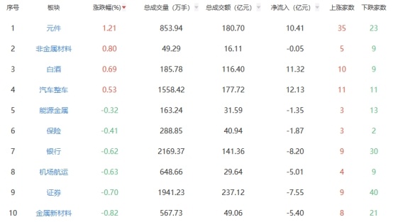 盘面上,元件、非金属材料、白酒等板块涨幅居前,影视院线、教育、零售等板块跌幅居前。