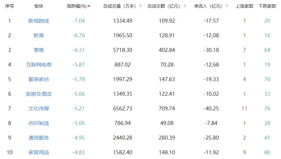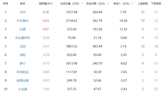 行业板块方面,元件、汽车整车、白酒板块涨幅居前,影视院线、教育、零售等板块跌幅居前。