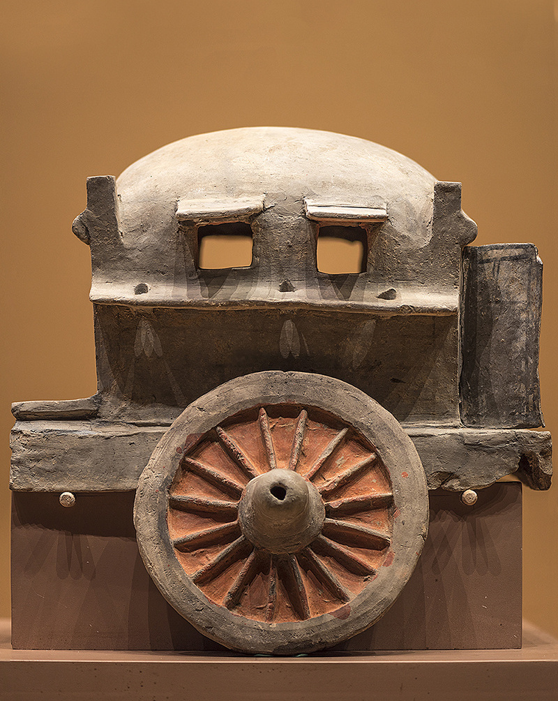 △大同市博物馆展厅内,一辆按比例浇铸的牛车和复原的北魏贵族出行图。