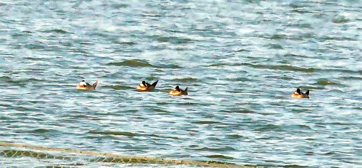 武汉市观鸟协会温馨提示:在武汉观测雁鸭一般距离都很远,白头硬尾鸭也不例外,因此最好有单筒望远镜才便于发现和观测;白头硬尾鸭的尾巴像天线一样上翘,非常有特点,可以明显区别于其他鸭类。
