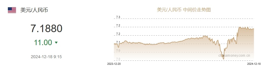中新网12月18日电 据中国外汇交易中心网站消息,中国人民银行授权中国外汇交易中心公布,2024年12月18日银行间外汇市场人民币汇率中间价为:1美元对人民币7.1880元,上调11个基点。