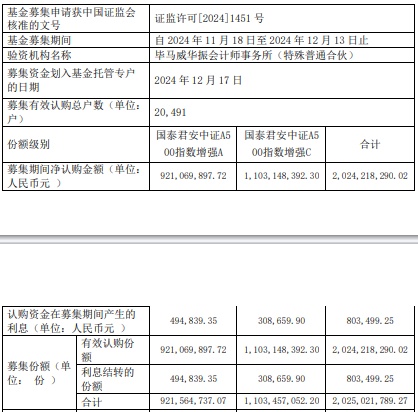 募集期间净认购金额2,024,218,290.02元,认购资金在募集期间产生的利息803,499.25元,募集份额合计2,025,021,789.27份。