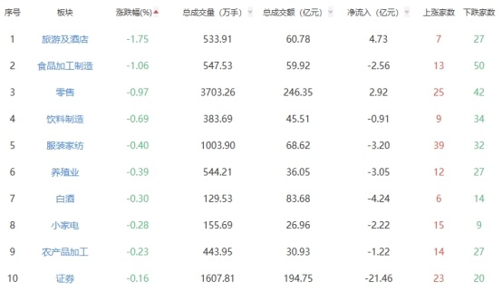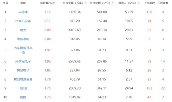 板块方面,半导体、计算机设备、电力等板块涨幅居前,旅游及酒店、食品加工制造、零售等板块跌幅居前。