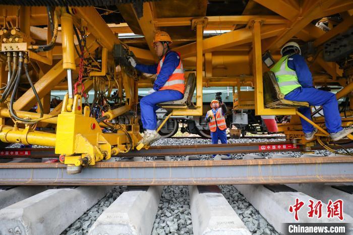 “我们首次采用内燃机车重联牵引无线同步操纵系统,确保运输安全。全面使用钢轨闪光焊远程监控诊断系统,保证焊轨质量。”刘超红说:“本次铺轨应用智能道砟摊铺机、智能数显螺栓紧固机、新能源锂电锯轨机等6种智能化设备,单日最高可铺设2公里轨道。”