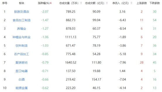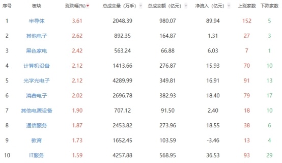 板块方面,半导体、其他电子、黑色家电等板块涨幅居前,旅游及酒店、食品加工制造、养殖业等板块跌幅居前。