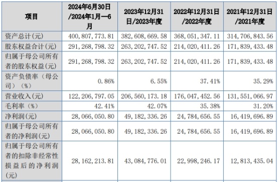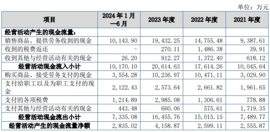 2021年至2023年及2024年上半年,林泰新材营业收入分别为1.32亿元、1.76亿元、2.07亿元、1.22亿元,净利润/归属于母公司所有者的净利润分别为0.16亿元、0.25亿元、0.49亿元、0.28亿元,归属于母公司所有者的扣除非经常性损益后的净利润分别为0.13亿元、0.23亿元、0.43亿元、0.28亿元;经营活动产生的现金流量净额分别为0.26亿元、0.26亿元、0.42亿元、0.28亿元。各期公司销售商品、提供劳务收到的现金分别为0.94亿元、1.48亿元、1.94亿元、1.01亿元。