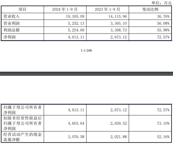 2024年前三季度,公司营业收入为1.93亿元,同比上升36.76%;净利润/归属于母公司所有者净利润0.46亿元,同比增长72.57%;扣除非经常性损益后的归属于母公司股东的净利润为0.46亿元,同比上升73.10%;经营活动产生的现金流量净额 0.31亿元,同比增长52.16%。