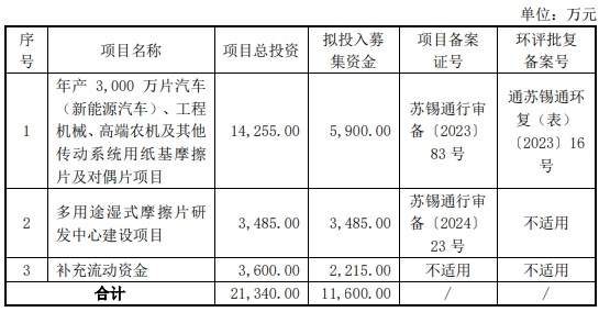 林泰新材2024年12月6日披露的招股书显示,公司拟募资11,600.00万元,用于“年产3,000万片汽车(新能源汽车)、工程机械、高端农机及其他传动系统用纸基摩擦片及对偶片项目”“多用途湿式摩擦片研发中心建设项目”和“补充流动资金”。