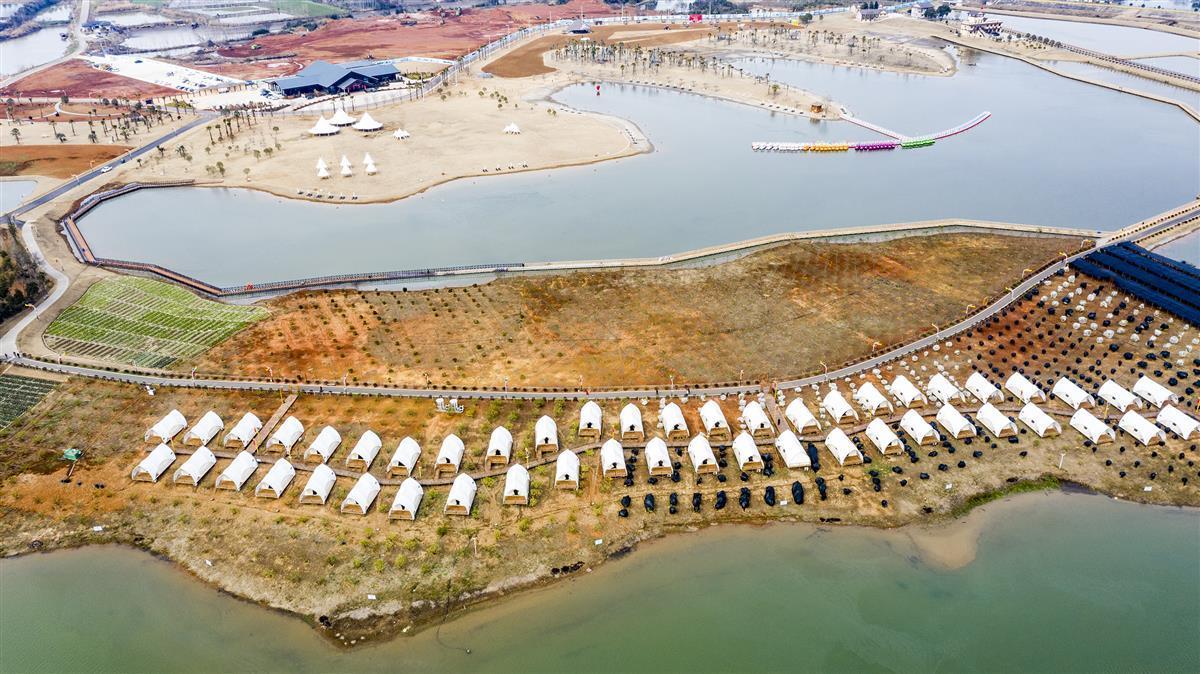 15日,在嘉鱼县陆口旅游度假区项目现场,映入眼帘的是整片的椰林和沙滩,一个个帐篷和沙滩躺椅错落布局,满满的热带度假风情。
