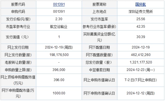 国货航2024年12月18日披露的首次公开发行股票并在主板上市发行公告显示,按本次发行价格2.30元/股计算,超额配售选择权行使前,预计公司募集资金总额为303,870.83万元,扣除约5,312.26万元(不含发行相关服务增值税、含印花税)的发行费用后,预计募集资金净额为298,558.57万元。若超额配售选择权全额行使,预计公司募集资金总额为349,451.42万元,扣除约5,721.86万元(不含发行相关服务增值税、含印花税)的发行费用后,预计募集资金净额为343,729.56万元。