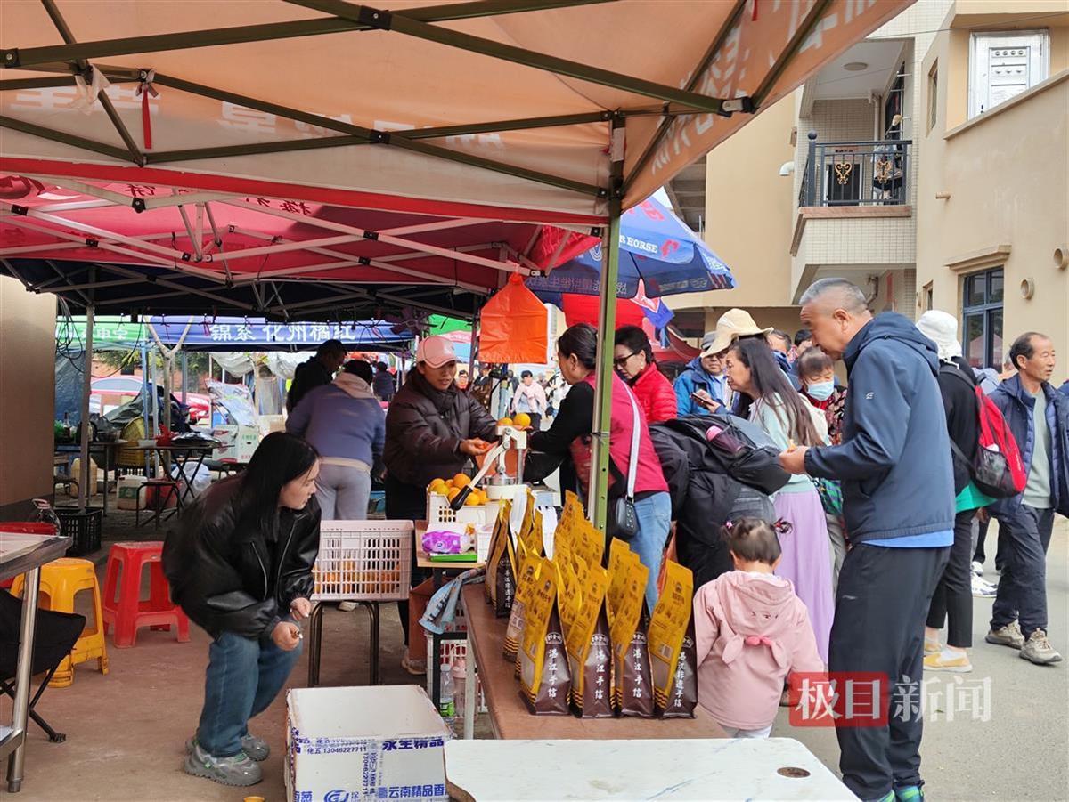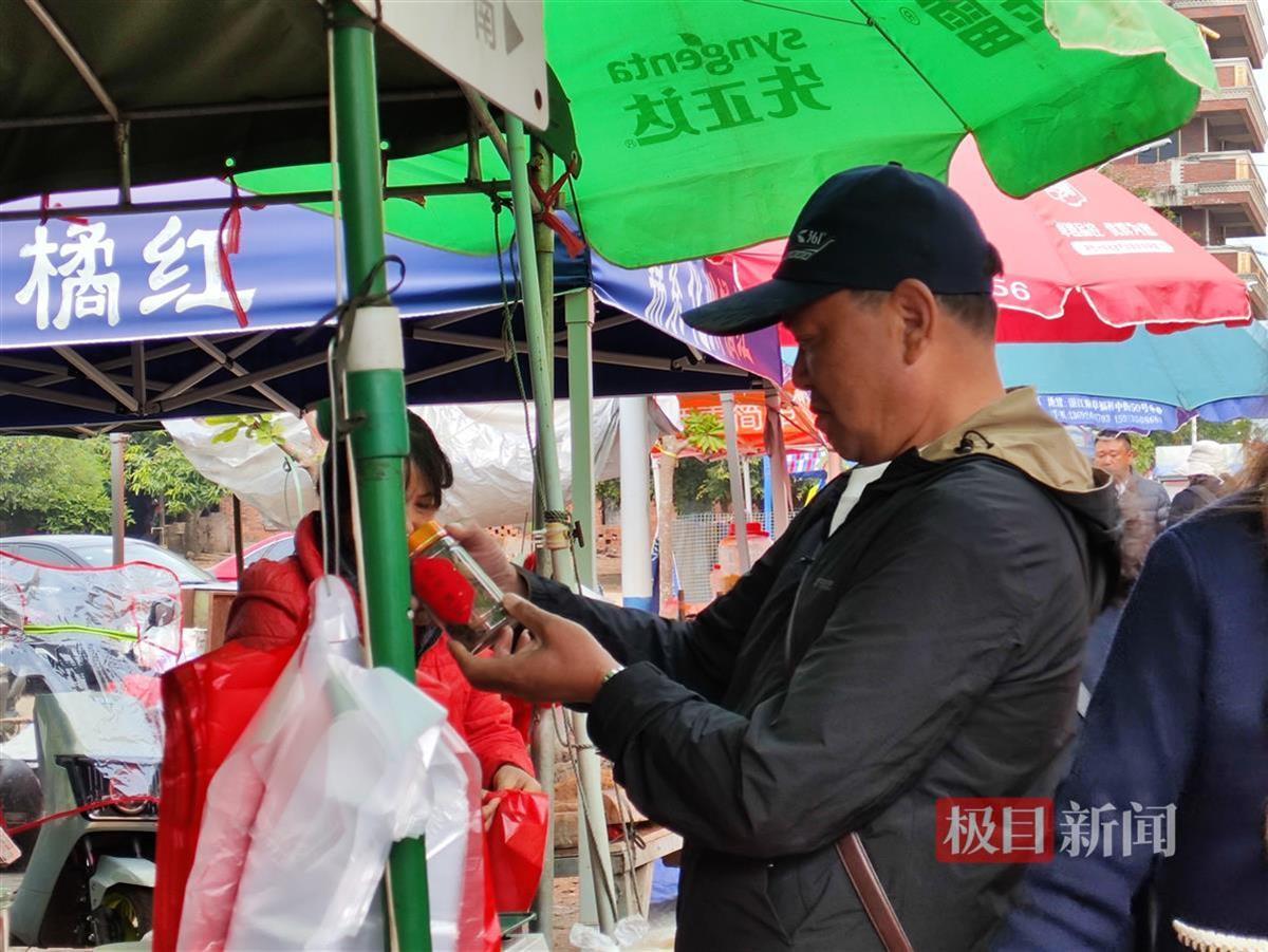 村里的摊贩数量也有所增加,还有人特意从外村赶来摆摊。陈勇住在几公里外的麻章镇上,平时在镇上卖鲜榨橙汁,但每逢周末,便会把摆摊阵地转移到迈合村,从八月到现在周周如此。