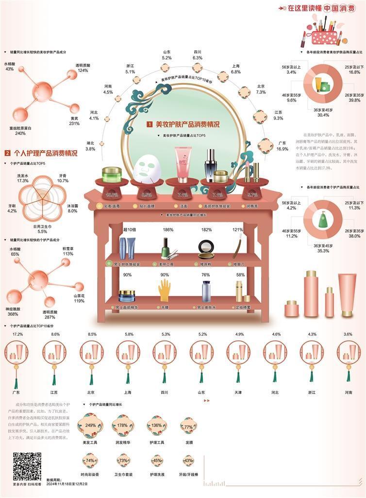 消费者对精细护理的需求逐渐延伸至头部、身体、口腔等全方位,润发精华、发膜等能够满足消费者精细需求的品类受青睐。同时,消费者对美妆个护产品成分的科学性和有效性更为关注,含有重组胶原蛋白、黄芪、透明质酸、水杨酸等成分的美妆护肤品销量增长最快。含有神经酰胺、透明质酸、山茶花、积雪草、水杨酸等成分的个人护理产品销量快速增长。