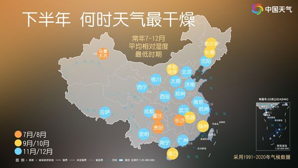 中国天气网统计1991至2020年气候数据发现,常年下半年,全国有超过一半的大城市平均相对湿度最低时期出现在11至12月,包括西宁、银川、西安、太原、北京、济南、郑州、沈阳、南京、杭州、武汉、成都、昆明、南宁、广州、拉萨共16个省会首府直辖市。中国天气网气象分析师沈雨旸表示,常年此时,暖湿气流减弱,降水量整体减少,且常有冷空气南下,形成干冷气团控场的局面,会导致空气比较干燥。