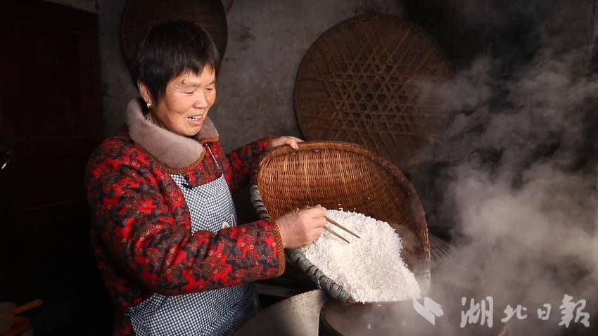 长梁镇白云村三组村民左垂英:“现在开始蒸糯米,大概要二十分钟到半小时,蒸好了再散开,然后放在阴凉处阴干。”