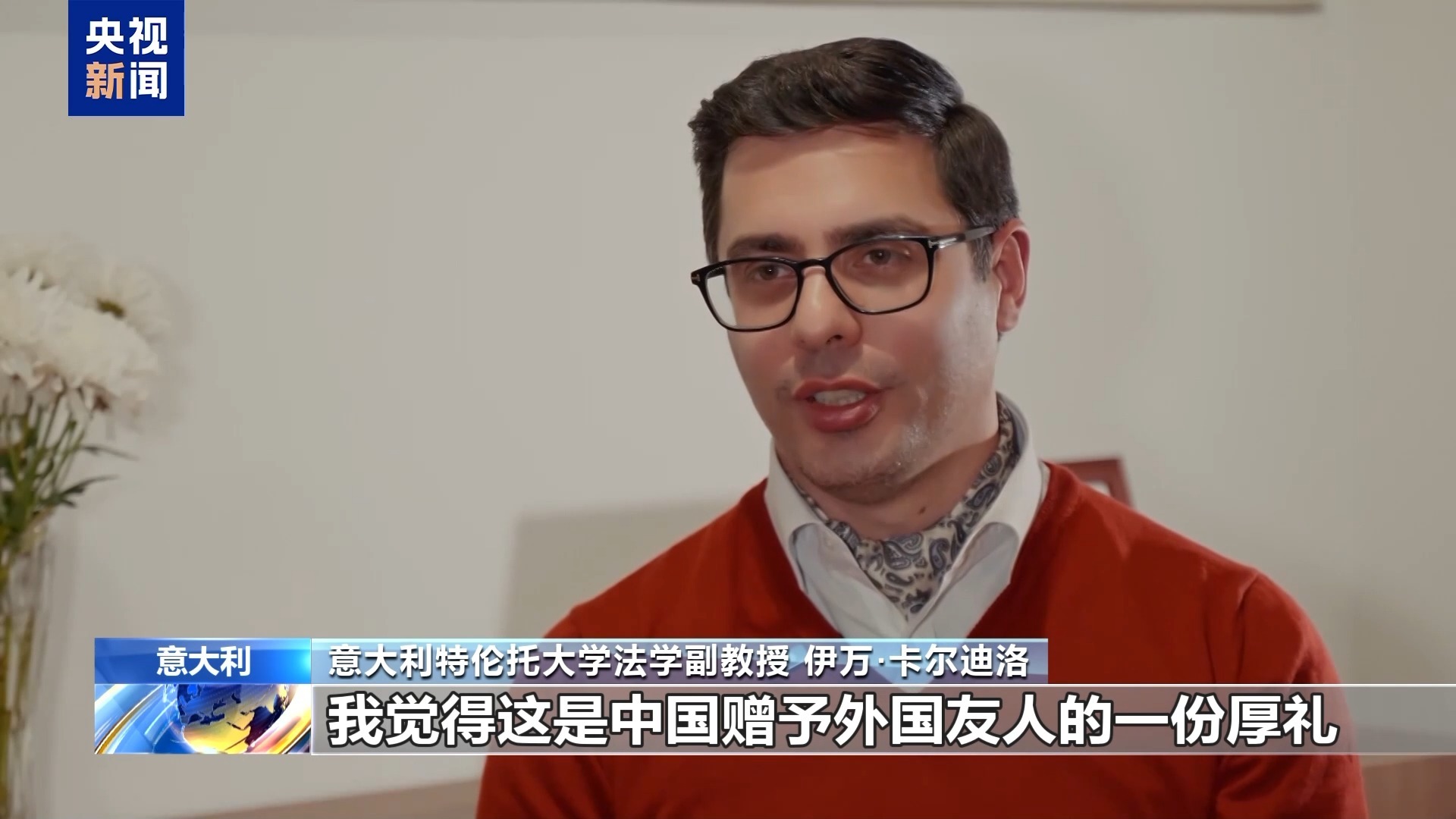 意大利特伦托大学法学副教授 伊万·卡尔迪洛:中国过境免签政策全面放宽优化,我觉得这是中国赠予外国友人的一份厚礼。现在简单极了,只要带着护照上飞机就可以了,可以说走就走。