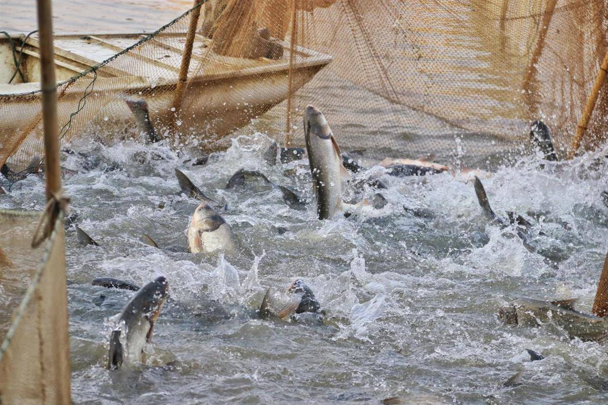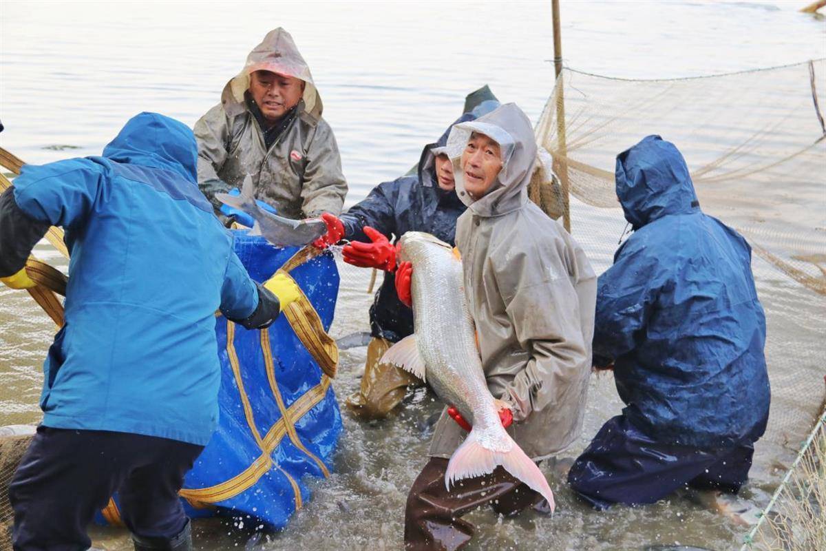 当日,只听得一声号令,捕鱼师傅们齐刷刷地收网,原本平静的湖面渐渐绽开了水花,随着范围越收越小,鱼群跃出水面。