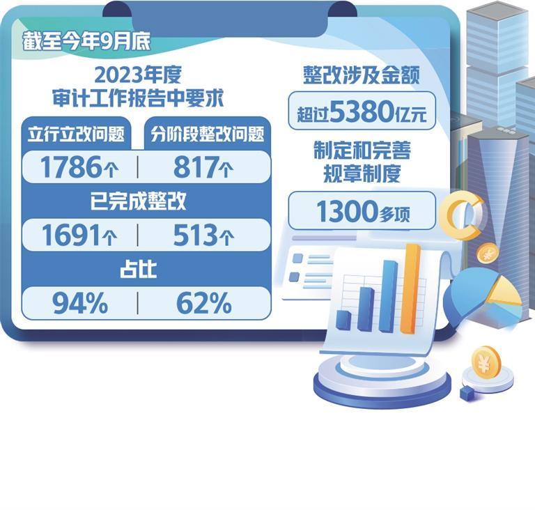 12月22日,受国务院委托,审计署审计长侯凯向十四届全国人大常委会第十三次会议作了《国务院关于2023年度中央预算执行和其他财政收支审计查出问题整改情况的报告》。截至今年9月底,1786个立行立改问题和817个分阶段整改问题中,分别有1691个和513个已完成整改,占比分别为94%和62%。整改涉及金额超过5380亿元,制定和完善规章制度1300多项,追责问责2800多人。在多方协同下,审计整改“下半篇文章”有力有效,对惠民生、稳经济发挥了重要作用。