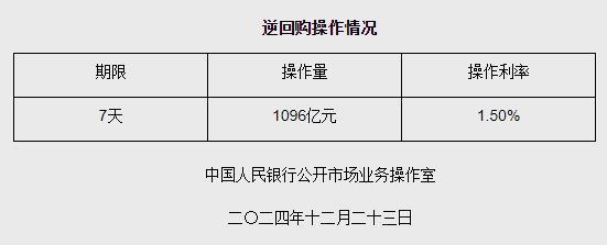 中新网12月23日电 据中国人民银行网站消息,为保持银行体系流动性充裕,2024年12月23日人民银行以固定利率、数量招标方式开展了1096亿元逆回购操作。具体情况如下:
