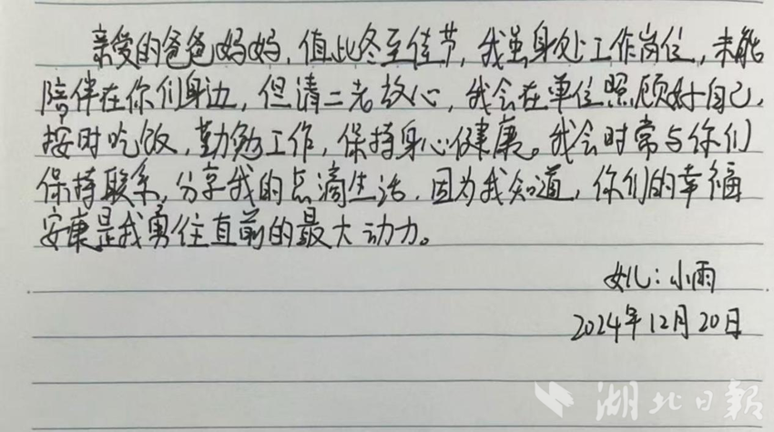 “亲爱的爸爸妈妈,值此冬至佳节,我虽身处工作岗位,未能陪伴在你们身边,但请二老放心,我会在单位照顾好自己,按时吃饭,勤勉工作,保持身心健康。我会时常与你们保持联系,分享我的点滴生活,因为我知道,你们的幸福安康是我勇往直前的最大动力。”
