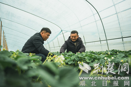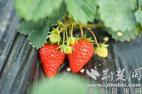 荆楚网(湖北日报网)讯(通讯员 叶玉兵)碧草丛中一点红,色飞汁液美无穷。眼下,又到了荆门市漳河新区双喜街道袁集村草莓成熟上市的季节,一颗颗草莓鲜红饱满,引人垂涎,成为水果市场的“新宠”。
