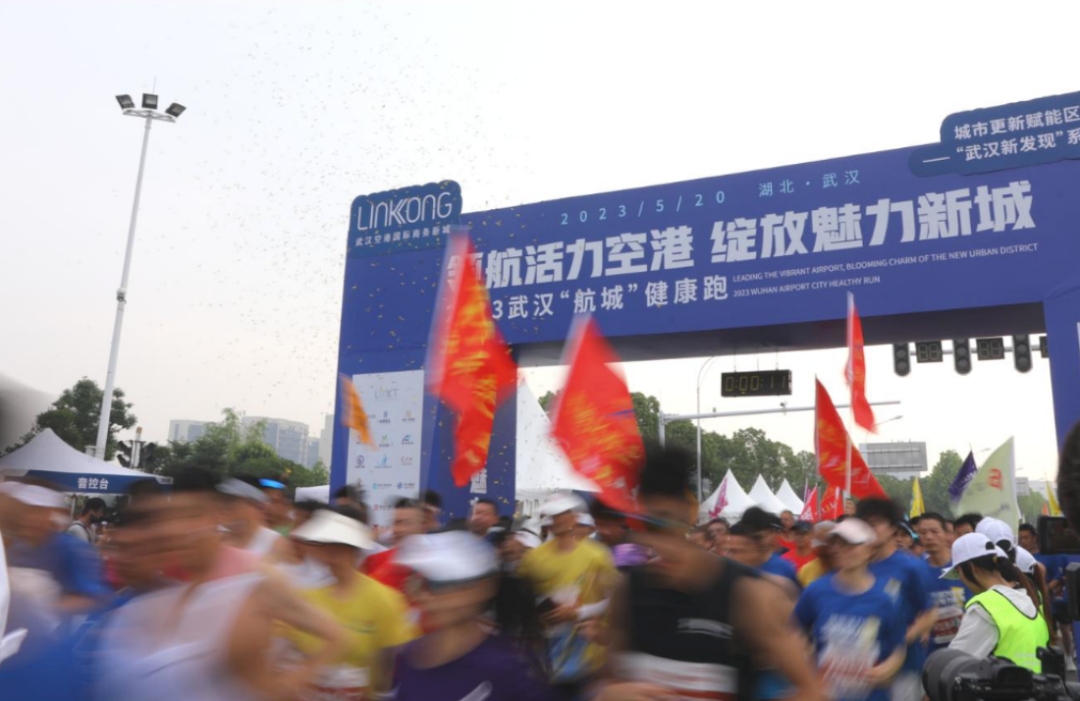 5月20日,2023年武汉“航城”健康跑在武汉空港国际商务新城空港中心鸣枪开跑。“520”告白航城,近3000名跑者驰骋赛道,为爱出发。