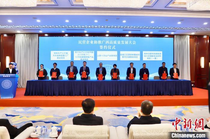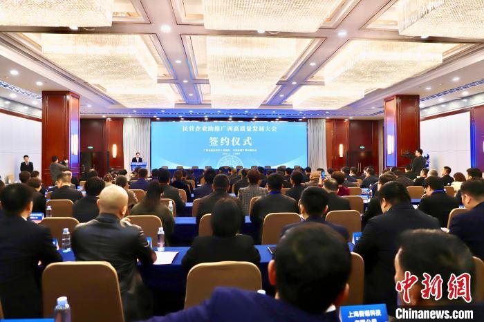 中新网南宁12月23日电(陈秋霞 林浩 王以照)2024年民营企业助推广西高质量发展大会签约仪式23日在广西南宁举行,现场集中签约招商引资项目52个,涉及金属新材料、绿色化工、食品加工、生物医药、新能源等领域。