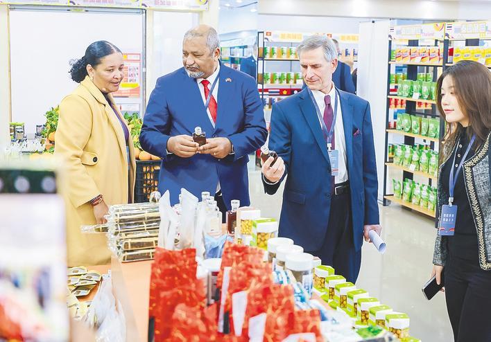11月12日,外宾在参观商品展销会。当天,武汉(汉口北)商品交易会在武汉黄陂隆重开幕。来自30个国家的外交使节、商会协会负责人和东盟国家企业代表出席大会。 (湖北日报全媒记者 柯皓 摄)