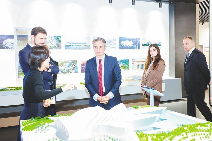 达索系统首席执行官帕斯卡·达洛兹(右一)参观中南建筑设计院展馆。 (中南建筑设计院供图)