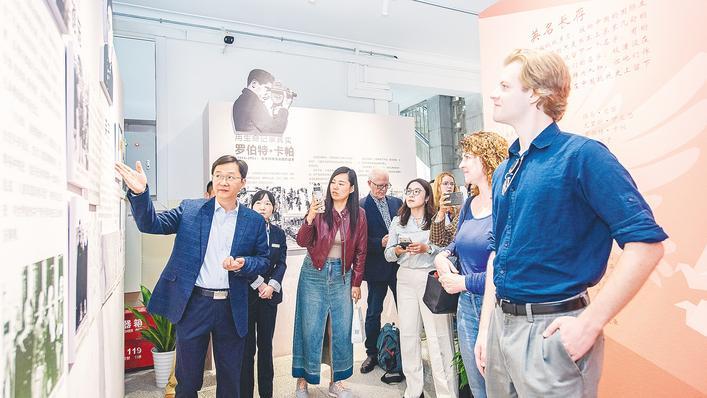 11月14日,著名国际友人法朗西斯·鲁兹的后代们走进八路军武汉办事处旧址纪念馆,回顾武汉抗战期间国际友人同中国军民并肩战斗的珍贵历史。(湖北日报全媒记者 何宇欣 摄)