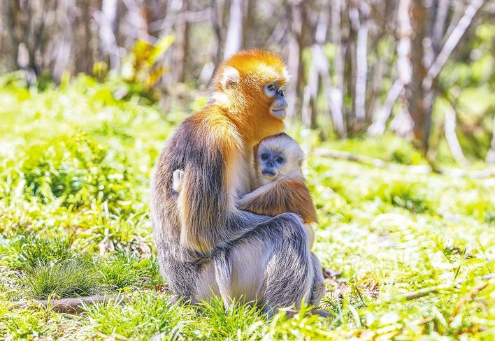 神农架大龙潭金丝猴野外研究基地,金丝猴宝宝依偎在母亲怀里。 (湖北日报全媒记者 薛婷 摄)